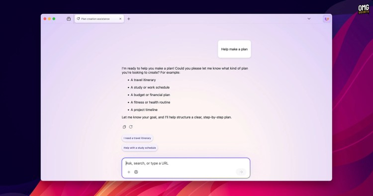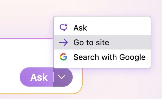 新标签页会删除了搜索栏和“推荐故事”信息(除了人工智能生成的传闻外,没有人有时间阅读其他内容)。此处有一个提示框,提示您“询问、搜索或输入网址”,并在下方添加建议的操作芯片: