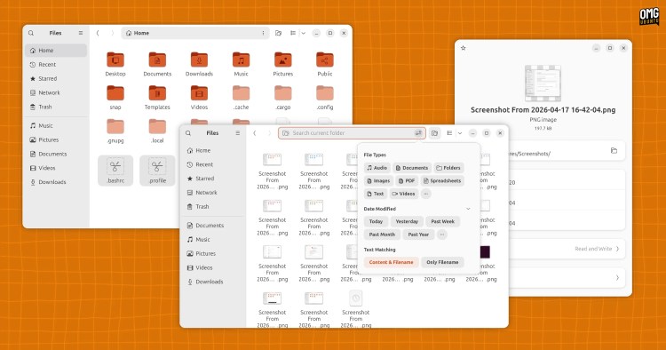 Nautilus 性能提升,目录加载速度更快,缩略图生成优先显示当前视图中的文件。搜索 UI 改进,支持日历小部件筛选。文件属性可作为浮动窗口打开。隐藏文件图标现在带有轻微透明度。